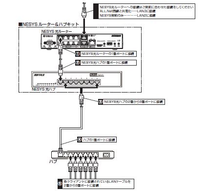 NESYS光ルーター同梱のLANケーブルを、NESYS光ルーターのLAN1(=/X)の【1】と、NESYS光ハブの【LAN1】に接続します。 |